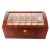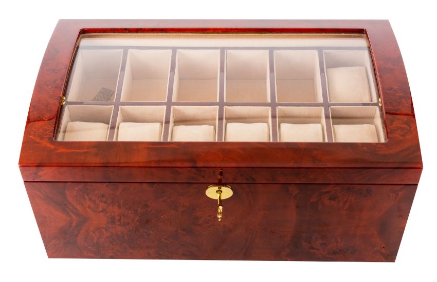 A wooden wristwatch display cabinet to hold twenty-four watches.