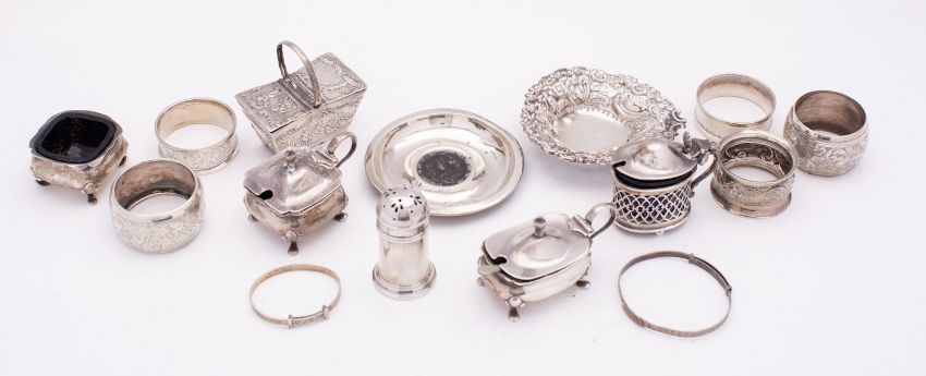 A mixed group of silver; including a Dutch silver miniature twin compartment picnic basket, five various napkin rings, a heart shaped bonbon dish, a coin dish, three silver mustard pots with blue glass liners, two adjustable bangles, 331gs., (10.6ozs.) gross, (13)
