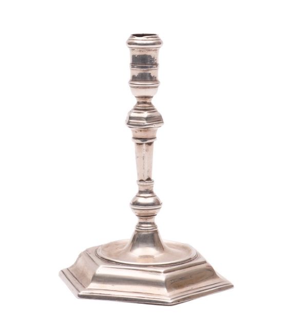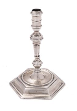 A George II cast taperstick, London 1725, on a bevelled hexagonal base with a knopped column,11cm (4 1/4in) high, 100g (3.2oz)