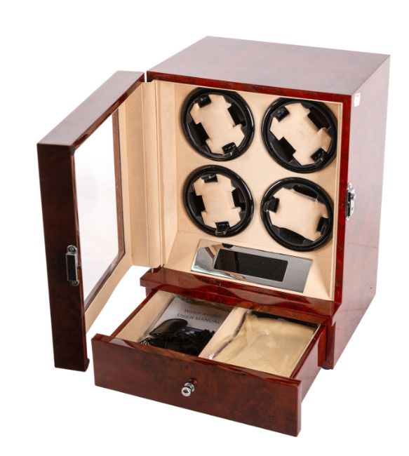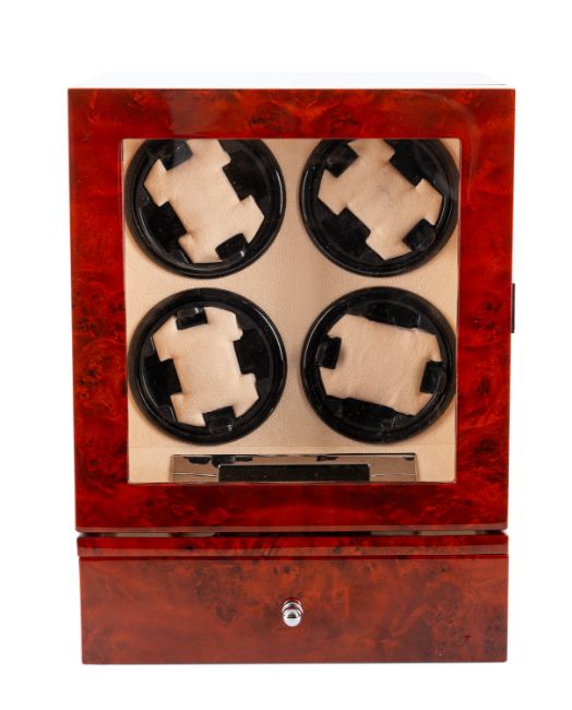 A wooden wristwatch display cabinet with automatic wind for four watches.