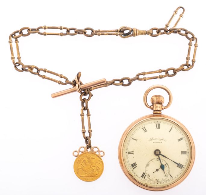 Bravingtons Renown a 9ct gold open-faced pocket watch the chrome-plated movement having a lever escapement and signed Renown, Swiss Made, with the dial having black Roman numerals, a subsidiary seconds dial and signed Bravingtons Renown, the case hallmarked for 9ct gold Birmingham 1941 and stamped Dennison Eclipse, A.L.D. diameter 48mm, total weight ca. 73.38gms, with a gold-plated watch chain complete with a 9ct gold T-bar and 1899 half-sovereign.