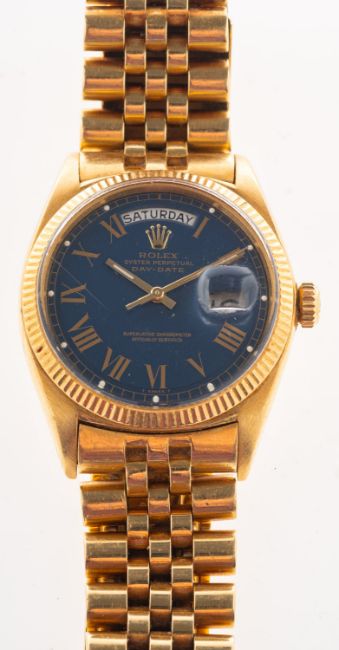 WITHDRAWN Rolex an 18k gold wristwatch the blue dial having raised Roman numerals, sweep seconds hand and day/date aperture, the movement stamped DD 14907, 1555, Rolex Geneve, 25 Fine Rubies, the case stamped within Montres Rolex S.A. Geneva Switzerland, Patented, 18K, 0.750, 1803, the Jubilee bracelet stamped .750, Rolex S.A., diameter 35mm, total weight ca. 113.09gs