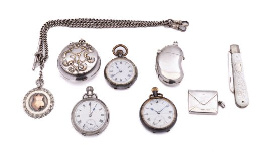 A mixed group of silver and silver plated items; including a kidney bean shaped vesta case by Deakin & Francis Ltd, Birmingham 1907, a silver and mother of pearl fruit knife, a silver stamp case, a silver curb link chain and fob, 54.5gs., (1.7ozs), gross, and three silver plated cased lady's open face watches and a small powder compact with mirror, (8)