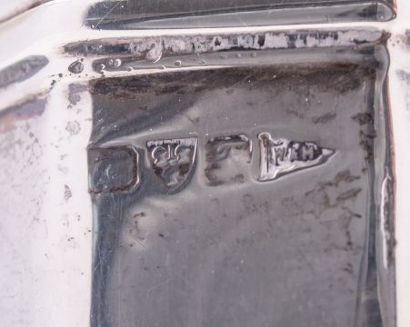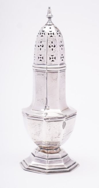 A George V silver sugar shaker by Walker and Hall, Chester marks rubbed, of octagonal baluster form, 202gs., (6.5ozs.)
