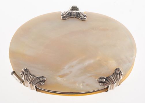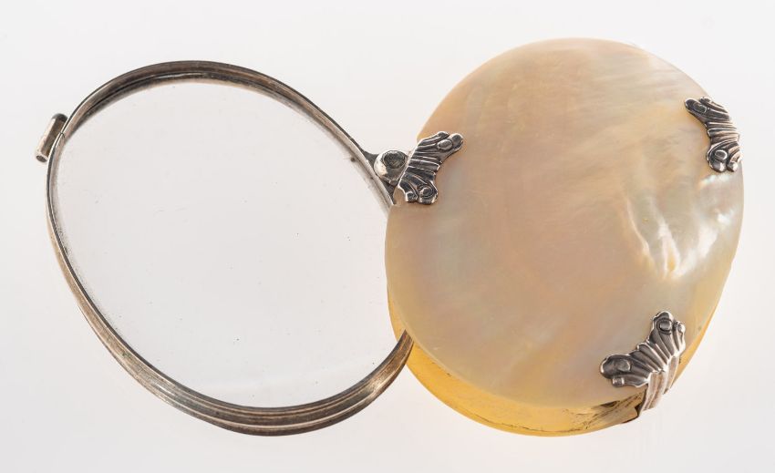 A Georgian magnifying glass in an oval white mother of pearl case, metal unmarked and untested, measuring approx. 6.7cm x 4.8cm, 64.1grams.