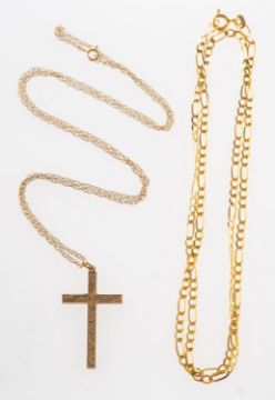A mixed group of jewellery, including a 9ct yellow gold cross pendant with foliate engraving, UK hallmark, on a fine belcher chain, marked 9k, length approx. 45.0cm, 2.8grams; and a 9ct yellow gold figaro chain, UK hallmark, approx. 44.0cm, 2.3grams, (3).
