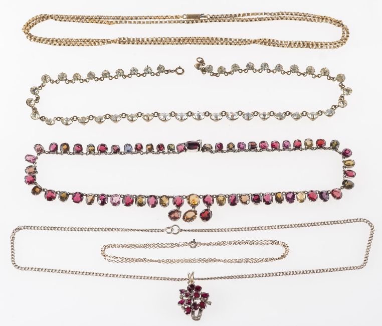 A mixed group of jewellery, including a graduated riviere necklace, collet & claw set with multi-coloured stones, unmarked & untested, length approx. 42.0cm, 29.6grams; a riviere necklace set with enclosed back paste stones, length approx. 41.0cm; a fancy-link gilt chain, length approx. 84.0cm; a curb-link chain, marked 925, length approx. 45.0cm, 2.0gram; a white metal pendant set with oval and marquise-cut red stones & small circular-cut white stones, unmarked & untested, length approx. 2.8cm, on a curb link chain, marked sterling, length approx. 45.0cm, total gross weight of pendant and chain 12.2grams, (6).