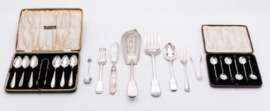 A small group of silver flatware; including a matched pair of London Fiddle pattern fish serving knife and fork, two dessert forks, a tea spoon, a silver and mother of pearl butter knife and a pair of sugar tongs, a case of six coffee bean spoons and a case of six tea spoons and a pair of sugar tongs, 558gs. (13.9ozs.), gross, (10)