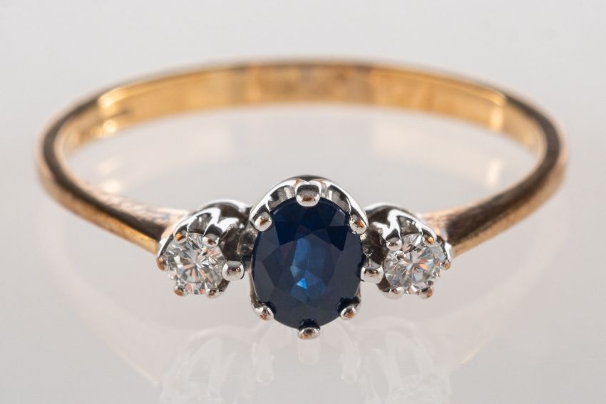 A 9ct gold sapphire and diamond ring, set with an oval-cut sapphire and two brilliant-cut diamonds, partial UK import mark, size P, 1.5grams.