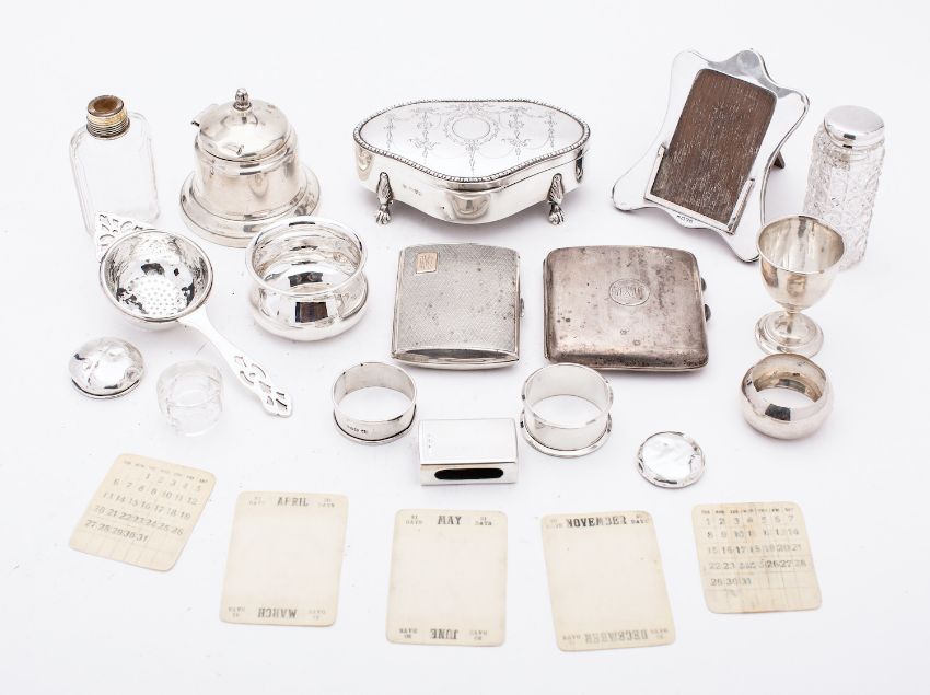 A mixed group of silver; including a dressing table ring casket maker's mark rubbed, Chester 1911, with fitted velvet interior, a cigarette case by T H Price & Co Ltd, Birmingham, of square form, engraved initials, a smaller cigarette case with engine turned decoration, inset yellow metal plaque with engraved initials, a small sugar bowl, a small match box cover, Birmingham tea strainer, three napkin rings, an egg cup, two dressing table jars with glass bases, a scent bottle with glass base, a capstan inkwell with loaded base and a silver calendar frame, 730gs., (23.4ozs.), gross, (15)