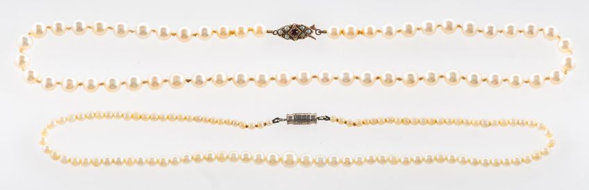 A group of two pearl necklaces, including a single row of cultured pearls to a seed pearl & garnet clasp, pearls approx. 6mm to 7mm, clasp marked 9ct, length approx. 43.0cm, 24.4grams; and a strand of graduated pearls to a silver screw clasp, pearls approx. 3mm to 7mm, clasp unmarked & untested, length approx. 38.0cm, 11.9grams, (with some spare loose pearls), (2).