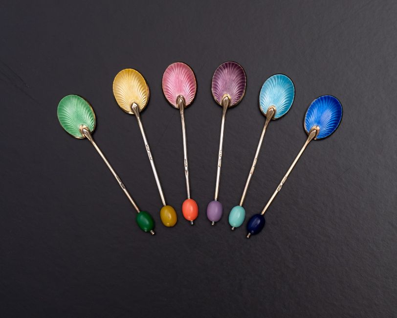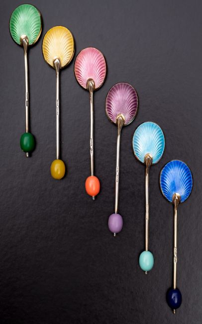 A set of six George V silver and enamel multi coloured coffee bean spoons by Fergenbaum & Son, Birmingham 1934, cased, with a set of six silver handled side knives cased, (2)
