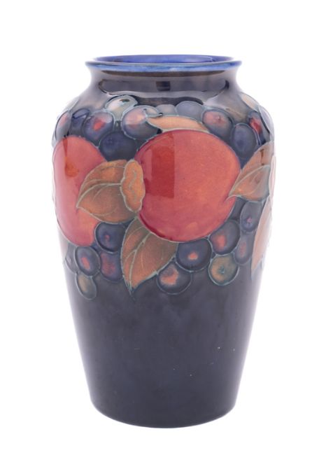 A Walter Moorcroft pottery vase of oviform, tube lined in the Pomegranate pattern on a blue ground, impressed Moorcroft Made in England with blue facsimile signature, 15.5cm high.