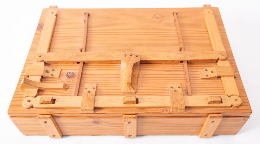 A pine puzzle box, circa 1980; of rectangular form; with exterior mechanism and red baize lined interior; 9cm high, 37cm wide, 28cm deepPROVENANCE: A gift from the artist Brian Chugg, to his wife, artist Mary Chugg in 1983