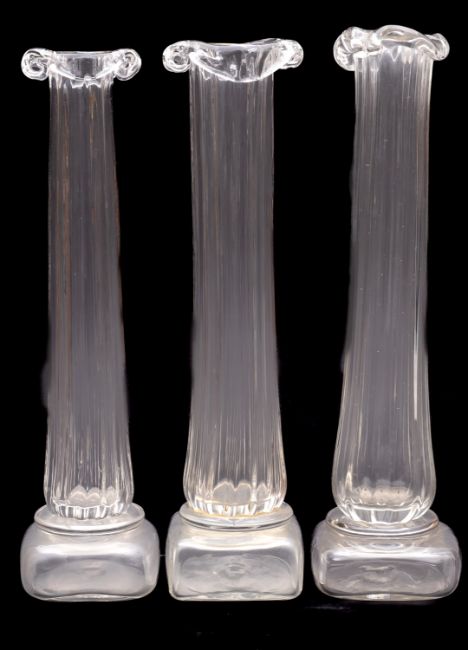 Patrick Stern [Contemporary] three clear glass vases with square base, fluted column and frill rim, diamond point signature to bases, 36cm high.