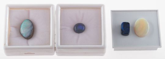 A collection of seven loose opals, to include a boulder opal, four black opals of varying shapes, sizes and colour, a white opal on host stone and one other white opal, (7).