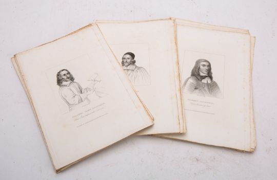 ENGRAVINGS. COOPER, R (engraver). A collection of 57 portrait engravings after various artists, London: Charles & Henry Baldwyn, nd, unframed, 25cm x 17cm; with BONNART, Jean Baptiste (engraver). A pair of coloured engravings after Jean Stella, Paris, nd, f&g, 27cm x 32cm; together with BEERBOHM, Sir Henry Maximilian 'Max'. A group of 8 portrait prints, unframed, 32cm x 21cm. (67) [sold as a miscellaneous collection and not subject to return]