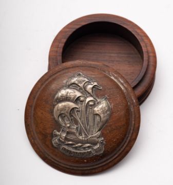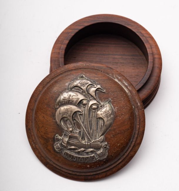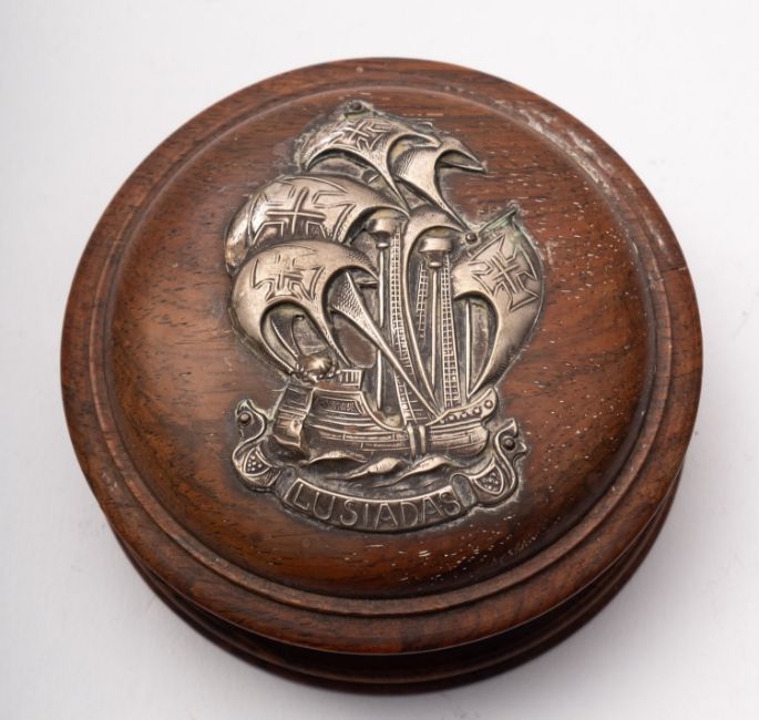 An early 20th century white metal mounted circular teen snuff box, the domed cover with repousse applique of a 16th century Spanish ship over the legend 'Lusiadas', 9.5cm diameter. *Notes- 'Lusiadas' is a reference to 'Os Lusiadas' the epic poem by Luis de Camoes published in 1572 describing the sea route to India discovered by Vasco de Gama.
