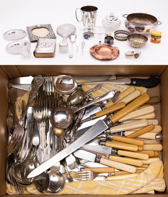 A mixed group of silver and silver plated items comprising of; Victorian silver photograph frame marks rubbed , two silver circular dishes, silver server & two silver butter knives, two silver topped jars with a silver plated mug, bowl, quantity of flatware, (a lot)
