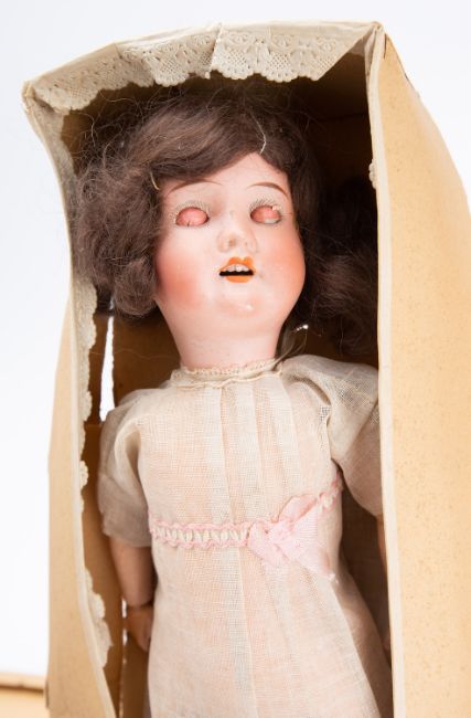 An early 20th century German bisque head doll, applied black wig, sleeping eyes, open mouth with teeth and painted face, marked ;Germany R' to back of head, over a jointed composition body wearing a muslin dress ,socks and white leather shoes, 42cm, in original box. *Notes- The doll is still attached to the base of the box with original string, box in poor condition. The eyes are stuck in the closed position.