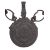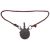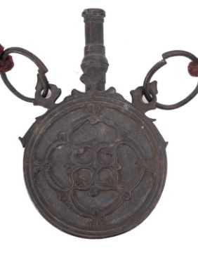 A 19th century Indo-Persian circular copper powder flask, with foliate decoration on a woven suspension, 10.5cm diameter.