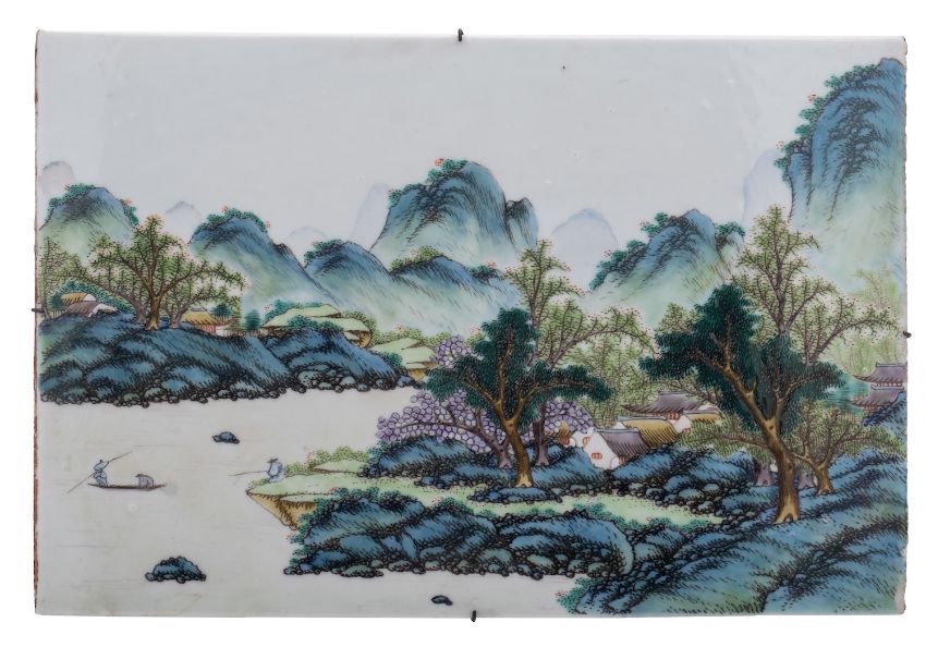 A pair of Chinese famille verte porcelain rectangular plaques painted with extensive mountainous river landscapes with a fisherman, sailing vessels and buildings with mountain peaks beyond, Republic/20th century, 26 x 39cm [both with one chip].