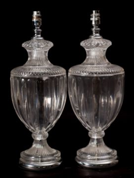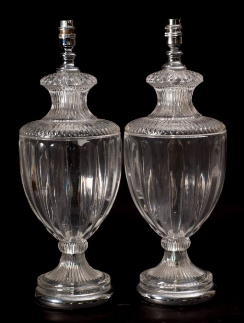 A pair of moulded clear glass table lamps, last quarter 20th century; modelled as lobed urns in Neoclassical taste; with circular bases; with chromium plated fitments and socles; 49cm high overall
