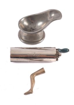 A pewter pipe holder, also 'The Climax' cigarette roller and a brass pipe tamper in the form of a lady's leg (3).Provenance: The Christopher Hawkings Collection of Curiosities.