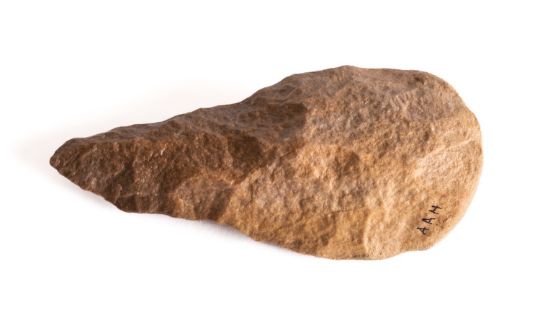 A Neolithic, Lower Palaeolithic quartzite hand axe, circa 300,000 years old; with museum accession code AAH12 to one side; 17.5cm long.PROVENANCE: Sands of Time, Washington D.C., USA, where the piece was described as Acheulian. Previously the Collection of Harold Hess, Virginia, USA.NOTE. Interestingly, whilst the hand axe was sold by the Washington DC dealer as being Acheulian, and therefore circa 70,000 years old, later correspondence with the British Museum (included with the lot) suggests a far earlier date of between 800,000 and 300,000 years