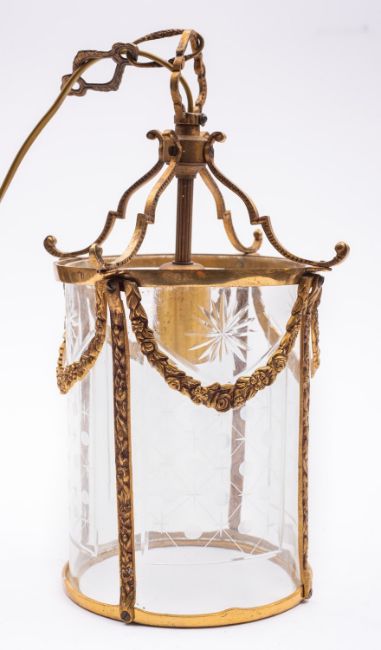 A gilt, brass and glazed ceiling lantern in 18th century taste, 20th century; of cylindrical form, the four bowed panes with cut and etched motifs; the four serpentine supports rising to a hanging ring; 33cm high overall