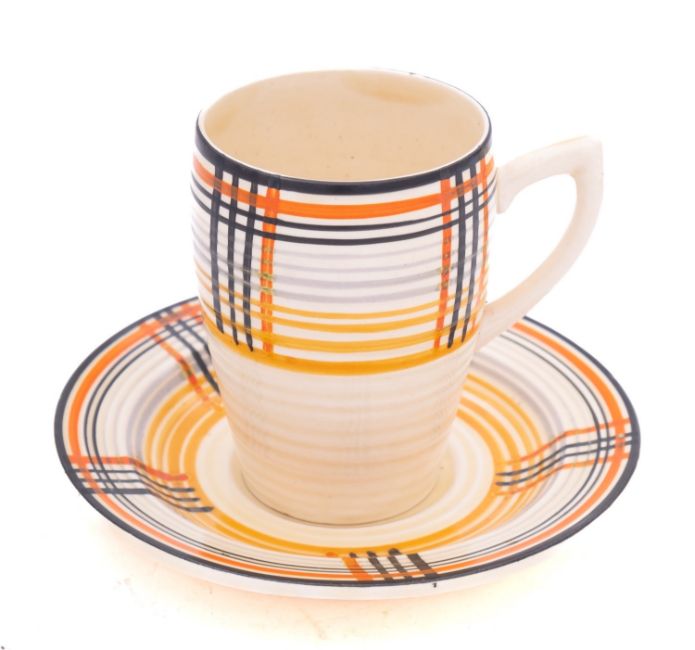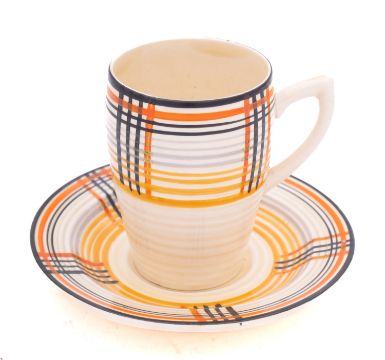 A Clarice Cliff Bizarre Lynton cup and saucer decorated in fine banding, printed marks, circa 1930-35.