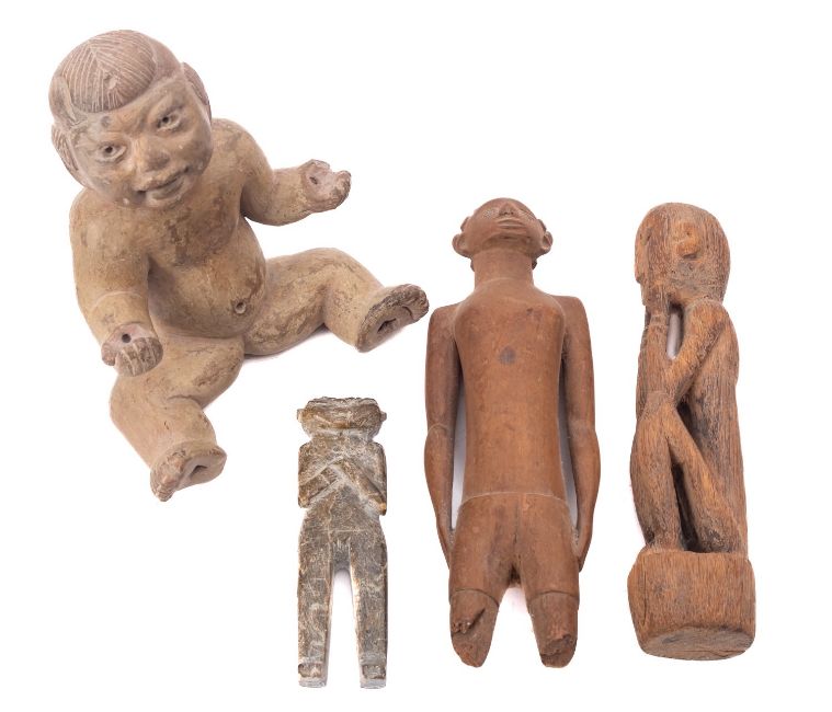 A Pre-Columban pottery figure, in Olmec style, probably 1st millenium BC; portrayed nude and seated, the hands raised before it, previously holding a further element, 17cm high, 16cm wide; an African carved wood seated figure, 20th century, 22cm high; another carved wood figure; and a carved soapstone stylised figure.