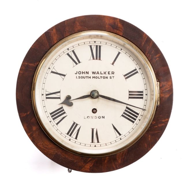 John Walker, London, a mahogany wall clock having an eight-day duration, single fusee timepiece movement with anchor escapement, the eight-inch round painted dial having black Roman numerals, blued-steel spade hands and signed John Walker, 1 South Molton St., London, with a later mahogany case, diameter 27cm.