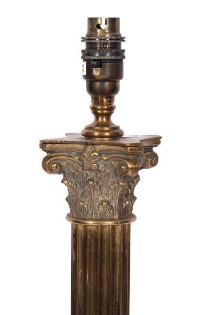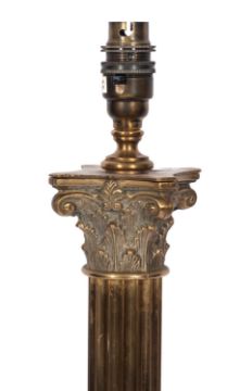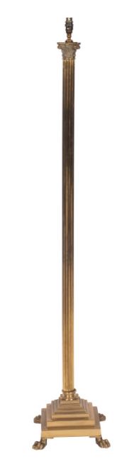 A brass standard lamp in Neoclassical style, 20th century; the electrical fitment on a Corinthian capital, with reeded shaft and stepped base, on four paw cast feet; 154cm high overall