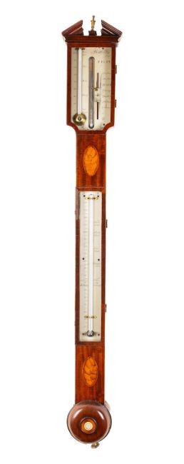 A Georgian mahogany stick barometer the silvered dial engraved with barometric markings, vernier gauge, hygrometer and signed Bellatty, the mahogany stick case with inlaid shell decoration to the trunk, a turned cistern cover and inset barometer to the trunk, surmounted by an architectural pediment with brass finial.