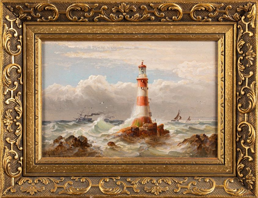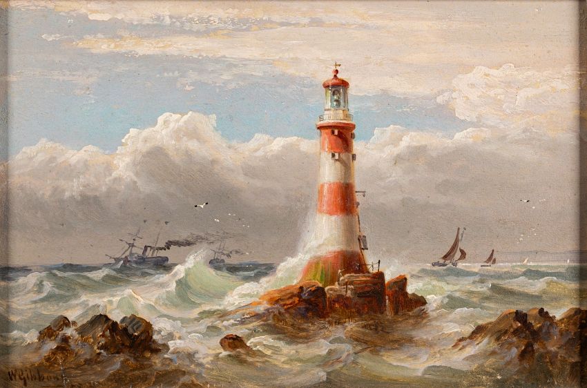 William Gibbons (British, 1840-1886) -Sail and Steam off the Eddystone: John Smeaton's lighthouse - Oil on board -15 x 23cm - 26 x 33cm framed -Signed and dated 1883 lower left
