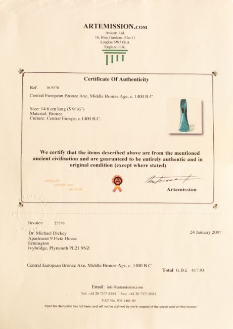 A central European bronze palstave axe head, Middle Bronze Age, circa 1400 BC; the body slotted to each side for the haft, above a flared blade; 14.5cm long.PROVENANCE: Artemission.com, London. The invoice for the item dated 24th January 2007 is included with the lot