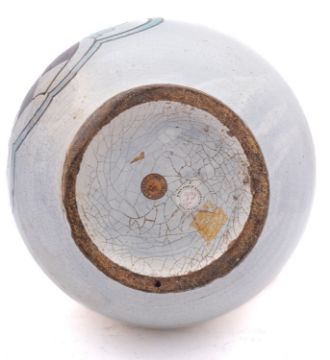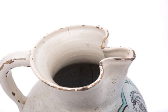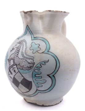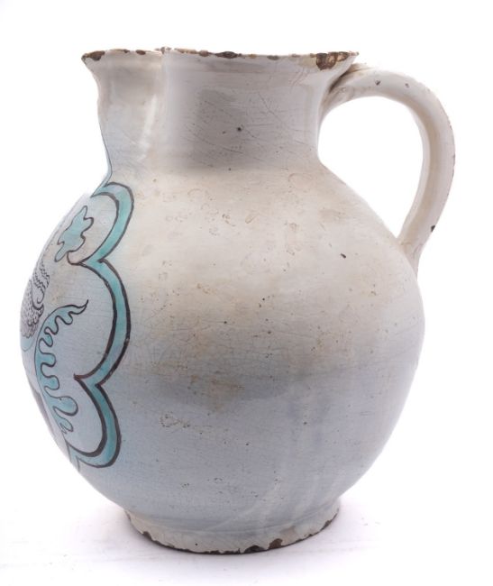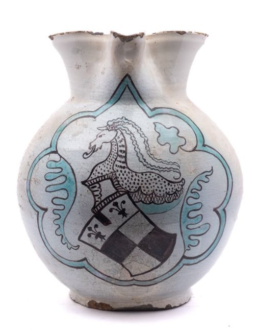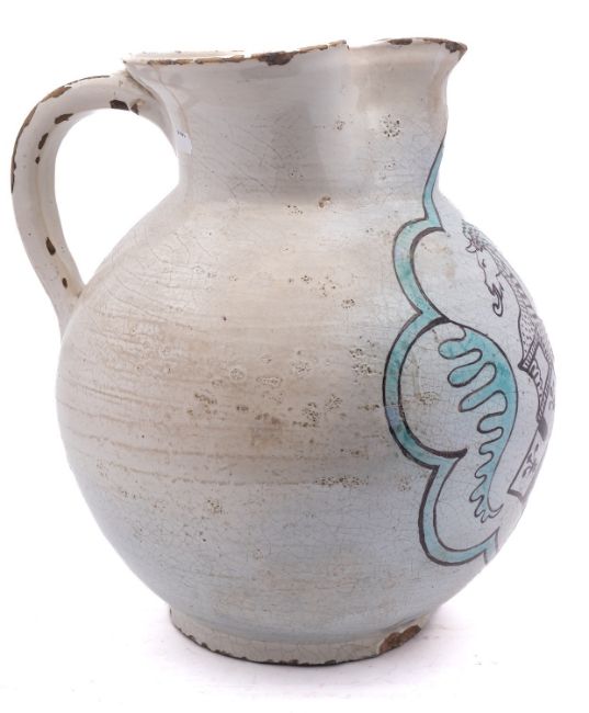 A massive Umbrian maiolica armorial jug, probably Orvieto, of globular form with pinched spout, painted in green and manganese with the arms of Manfredi of Bologna surmounted by a Unicorn within foliate cartouche, 15th century, 40.5cm high [some restoration and glaze losses].Provenance: paper labels for the Imbert Collection no.687, Rome; and the John Philip Kassebaum Collection no.91; also by repute the Thomas Harris Collection, London.