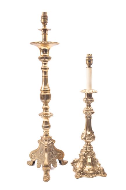 A metal table lamp modelled as a 17th century altar stick, modern; with knopped and waisted shaft to a triform base; 73cm high including electrical fitment; and a metal table lamp modelled as an early 18th century candlestick, modern; 55cm high including fitment