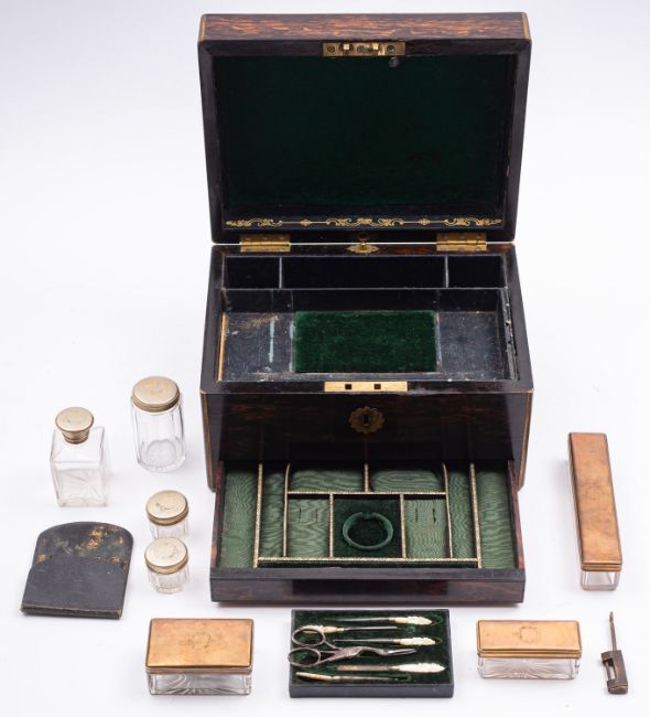 A Victorian brass bound coromandel dressing case, mid 19th century; the fully fitted interior with metal topped glass jars and mother-of-pearl handled implements; above a sprung jewellery drawer; 18cm high, 30cm wide