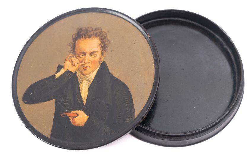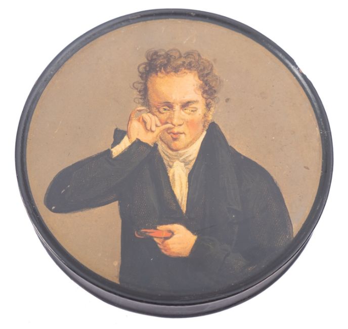 A mid 19th century Continental papier mache snuff box and cover painted with a gentleman taking snuff, 9.5cm [small chip to rim].