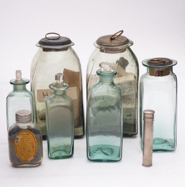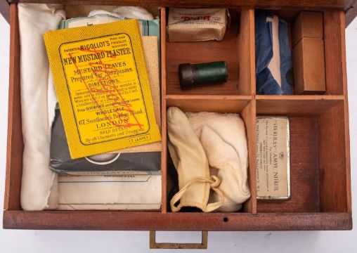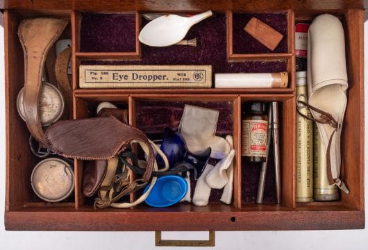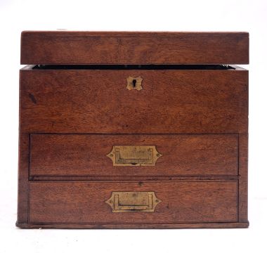 A mahogany and brass mounted apothecary's box, second quarter 19th century; the hinged cover with inset vacant plaque, the sides with recessed swing handles; the fitted upper section and two drawers beneath with various associated medical implements and related items; 31cm high, 38cm wide, 28cm deep
