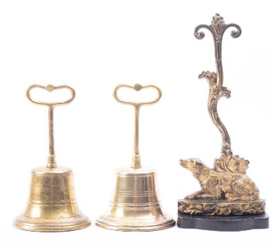 A pair of Victorian brass door porters modelled as half bells, late 19th century; with loop handles and weighted bases, 26cm high; and a Regency gilt bronze and iron mounted door porter modelled with a recumbent hound, circa 1815, 38cm high