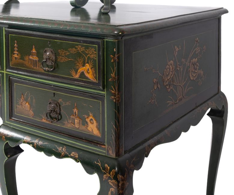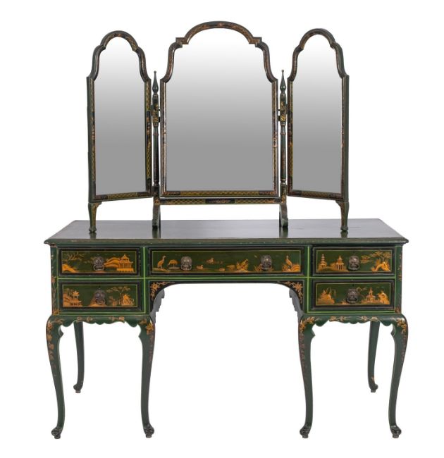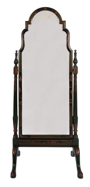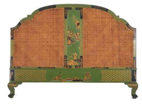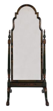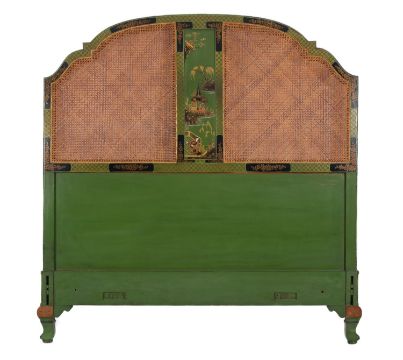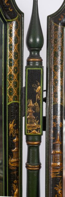 A suite of green painted and lacquered wood bedroom furniture in George II taste, late 20th century, all decorated in Chinoiserie style, comprising: a dressing table, 80cm high, 140cm wide; a tripartite table mirror, 87cm high; a cheval mirror, 183cm high; and the caned head and footboards of a double bed, 143cm high, 140cm wide