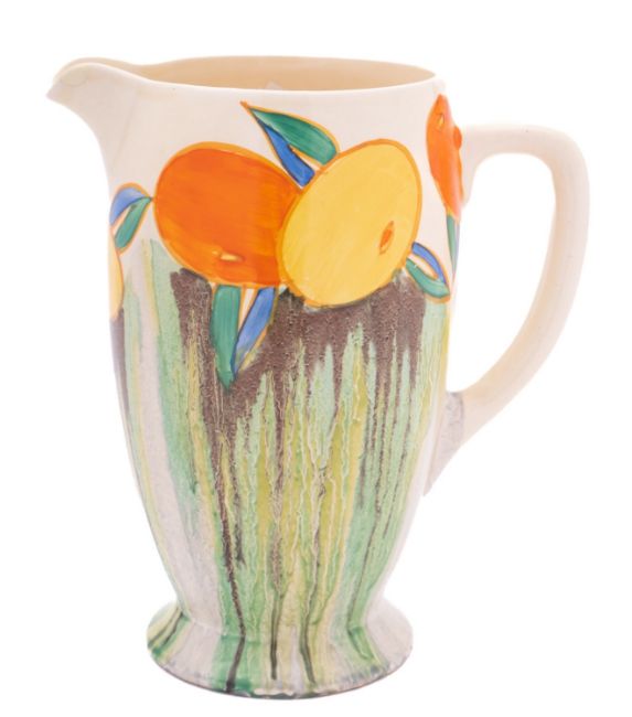 A Clarice Cliff Coronet jug decorated in the 'Delicia Citrus' pattern, printed marks, circa 1933, 18cm [small restored chip to spout].