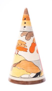 A Clarice Cliff Bizarre conical pattern sugar sifter decorated in the 'Coral Fir' pattern, printed marks, circa 1930-35, 13.5cm.