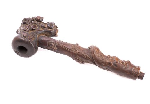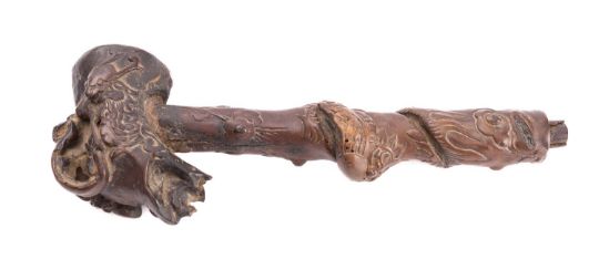 A Chinese rootwood pipe carved with a qilin and a lobster amongst peaches, flowers and foliage, 19th century, 26cm [some damage, mouthpiece lacking].
