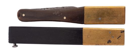 An Antique ebony and brass ink dip pen quill cutter, maker 'Rodgers, Cutlers to Her Majesty, Sheffield, England', 10cm long and another horn and brass quill cutter, 9.5cm long (2).Provenance: The Christopher Hawkings Collection of Curiosities.