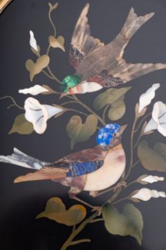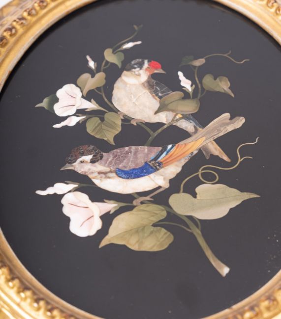 A pair of Italian oval pietre dure panels depicting birds, circa 1900, with gilt moulding frames; 29cm high overall