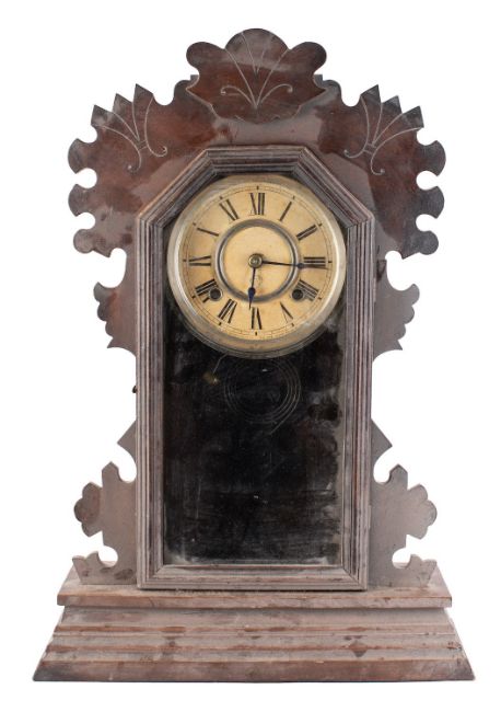 Ansonia, USA an oak Gingerbread shelf clock with a fully glazed front door, carved cresting and standing on a moulded base, height 54cm.
